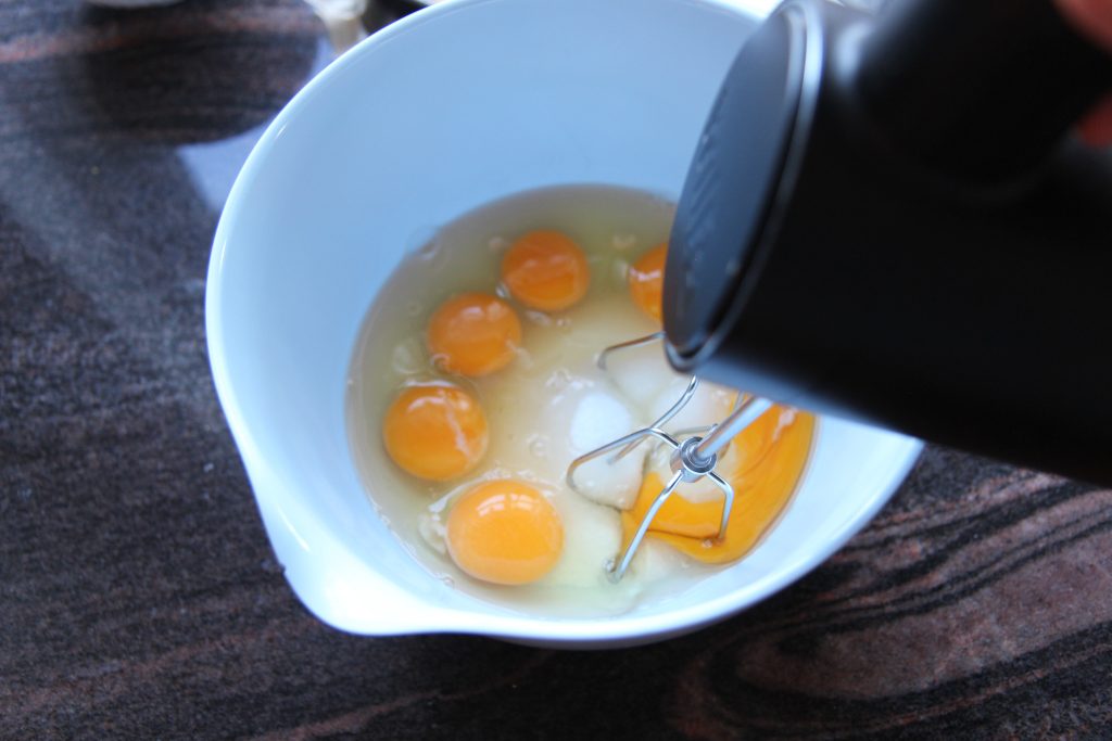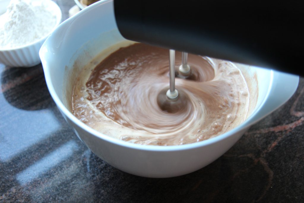 3. Tilsett smør/sjokolade i eggedosisen, rør det inn med en mikser.