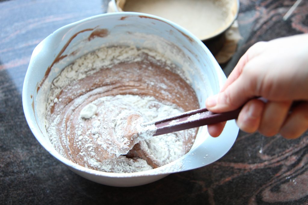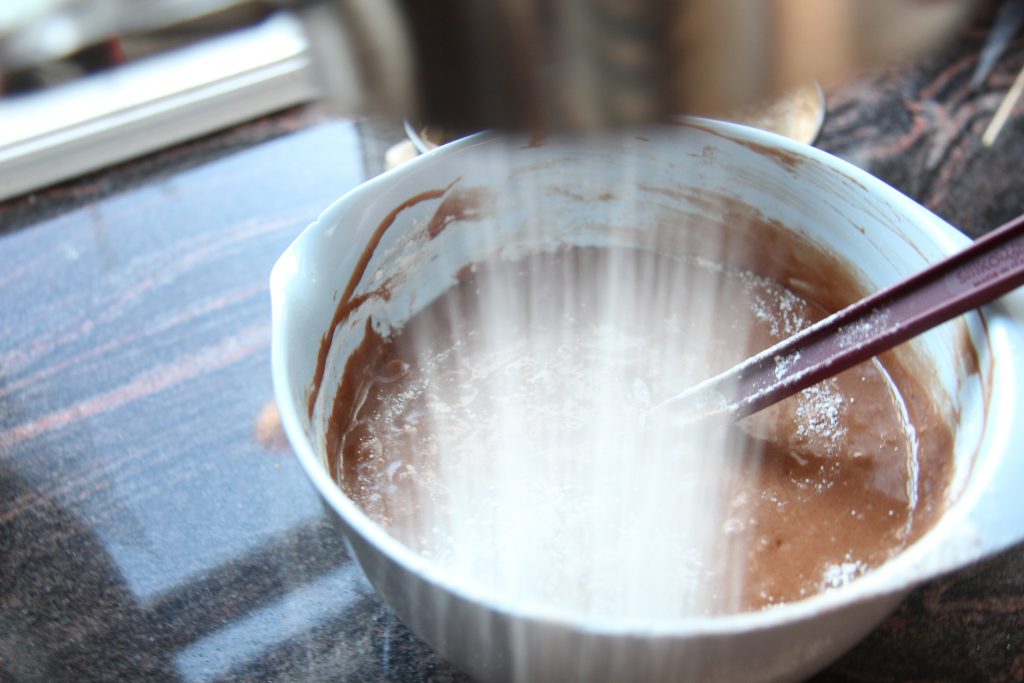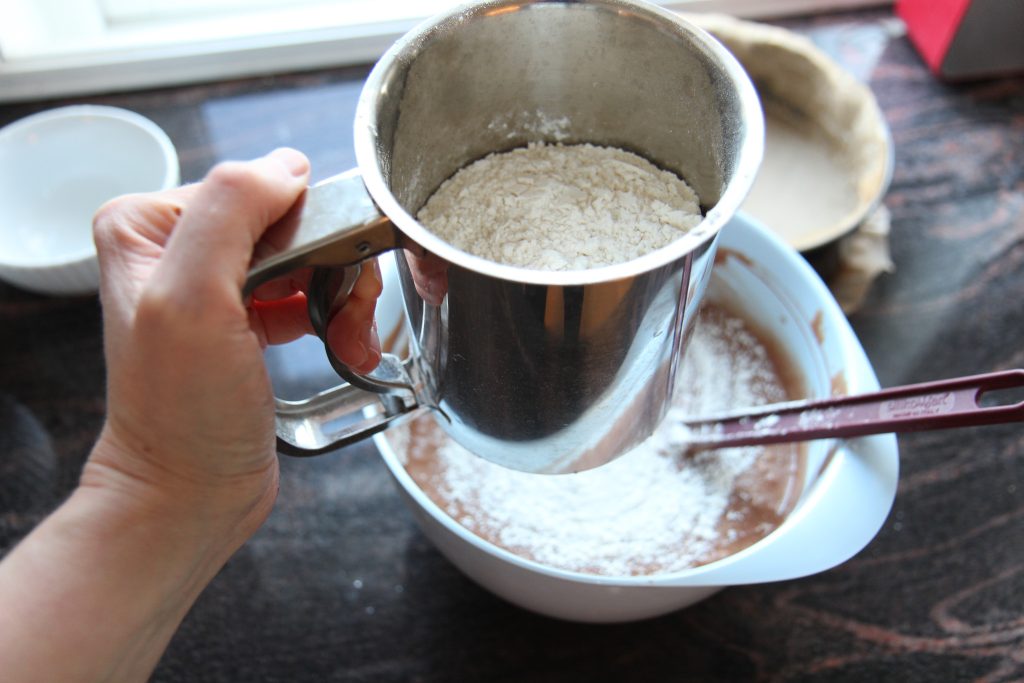4. Sikt inn melet, vend det gjerne inn med en slikkepott så du ikke slår ut for mye luft av massen. Rør til du ikke har klumper.