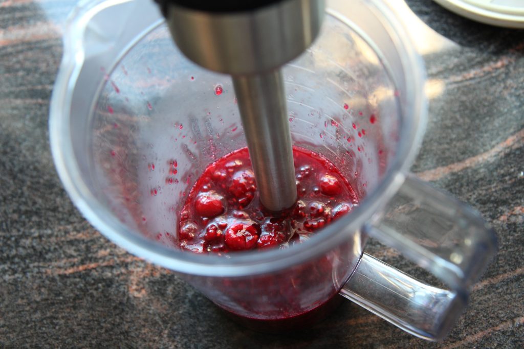 8. Kok opp sukker og bringebær. Bruk en stavmikser for å knuse bærene. Du velger selv om du vil sikte blandingen. Oppbevar coulisen i kjøleskapet frem til servering.