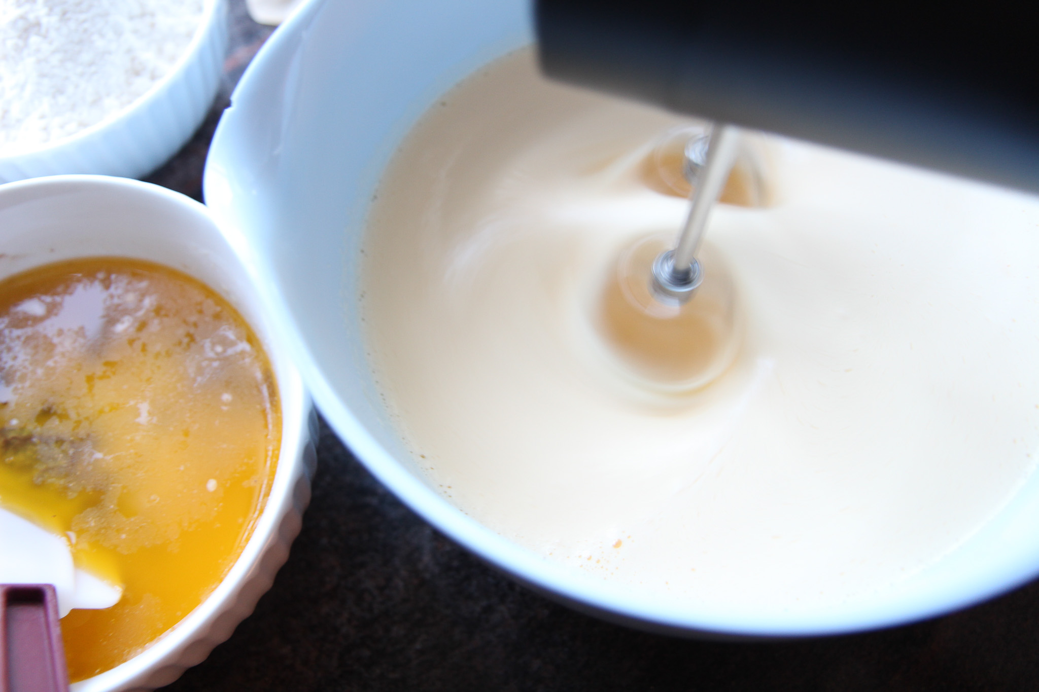3. Tilsett smør/sjokolade i eggedosisen, rør det inn med en mikser.