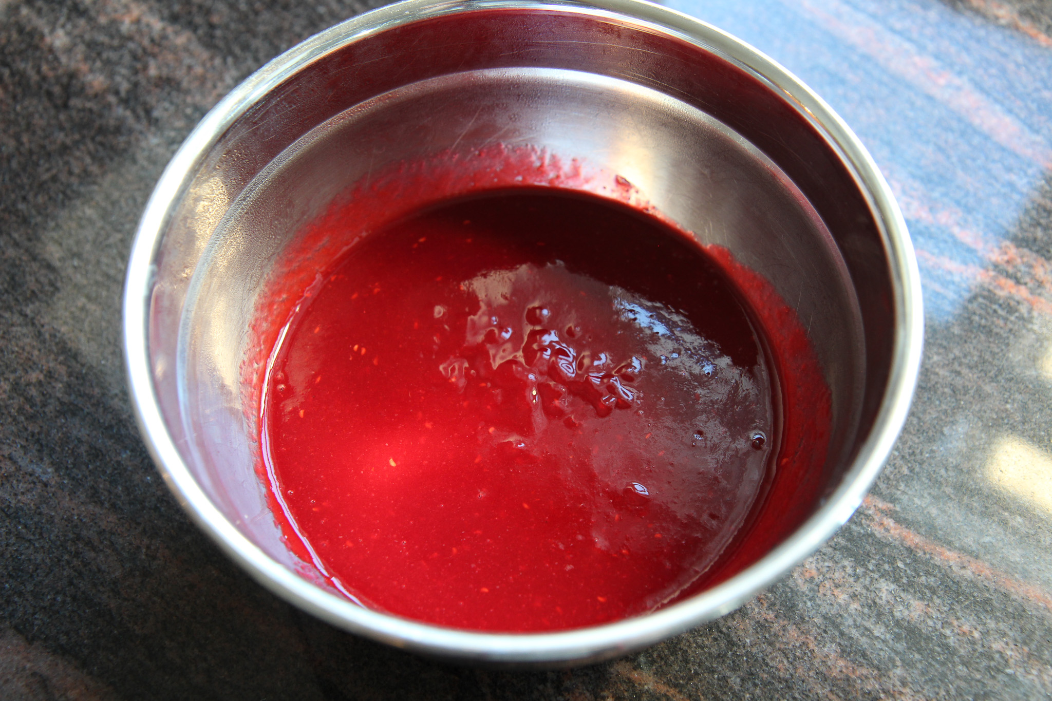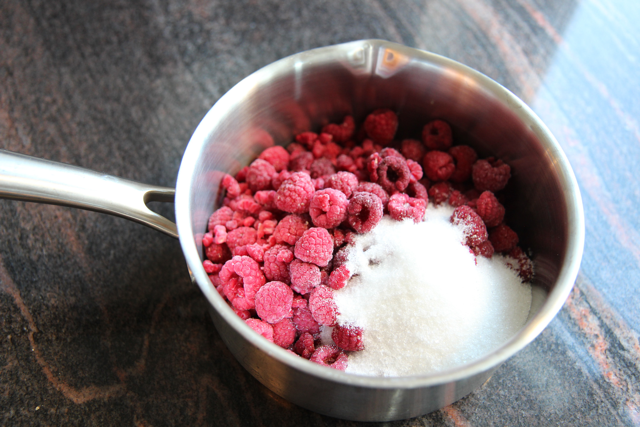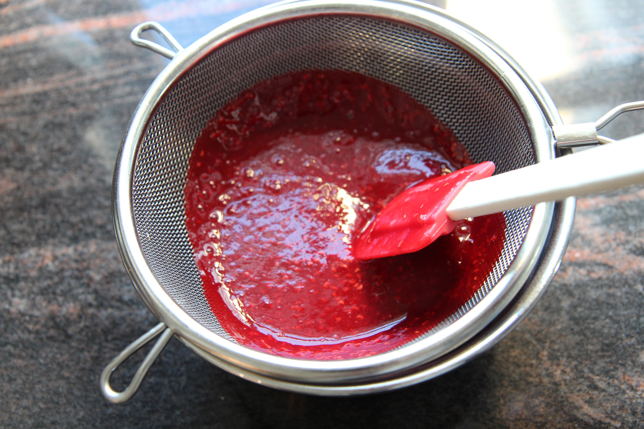 8. Kok opp sukker og bringebær. Bruk en stavmikser for å knuse bærene. Du velger selv om du vil sikte blandingen. Oppbevar coulisen i kjøleskapet frem til servering.