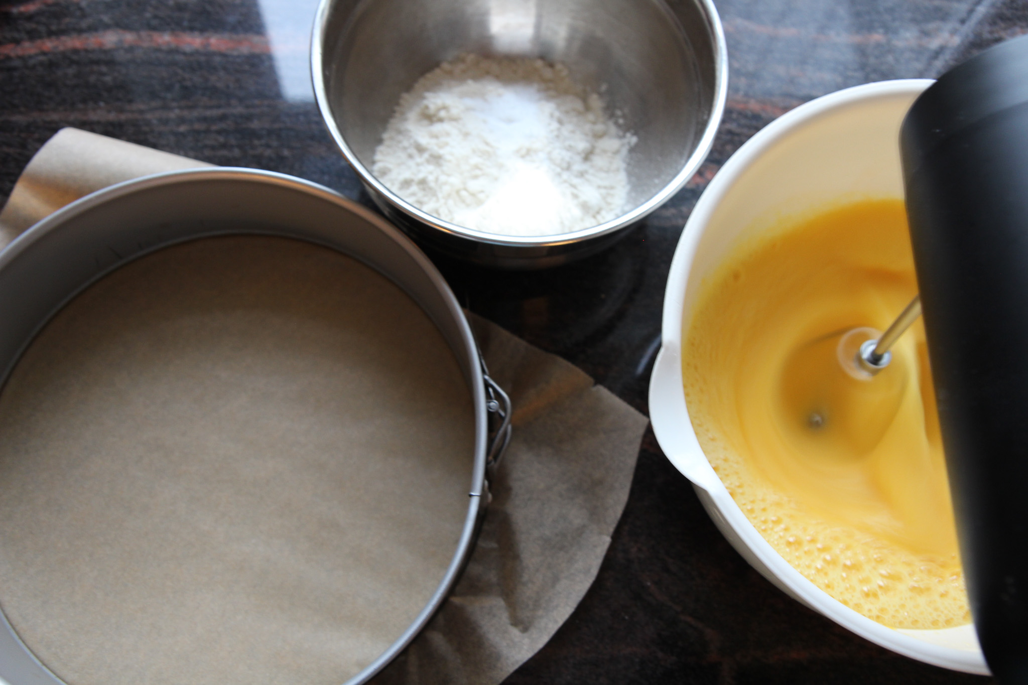 1. Pisk egg og sukker til lys og luftig eggedosis. Sikt inn hvetemel og bakepulver. Vend inn med en slikkepott.