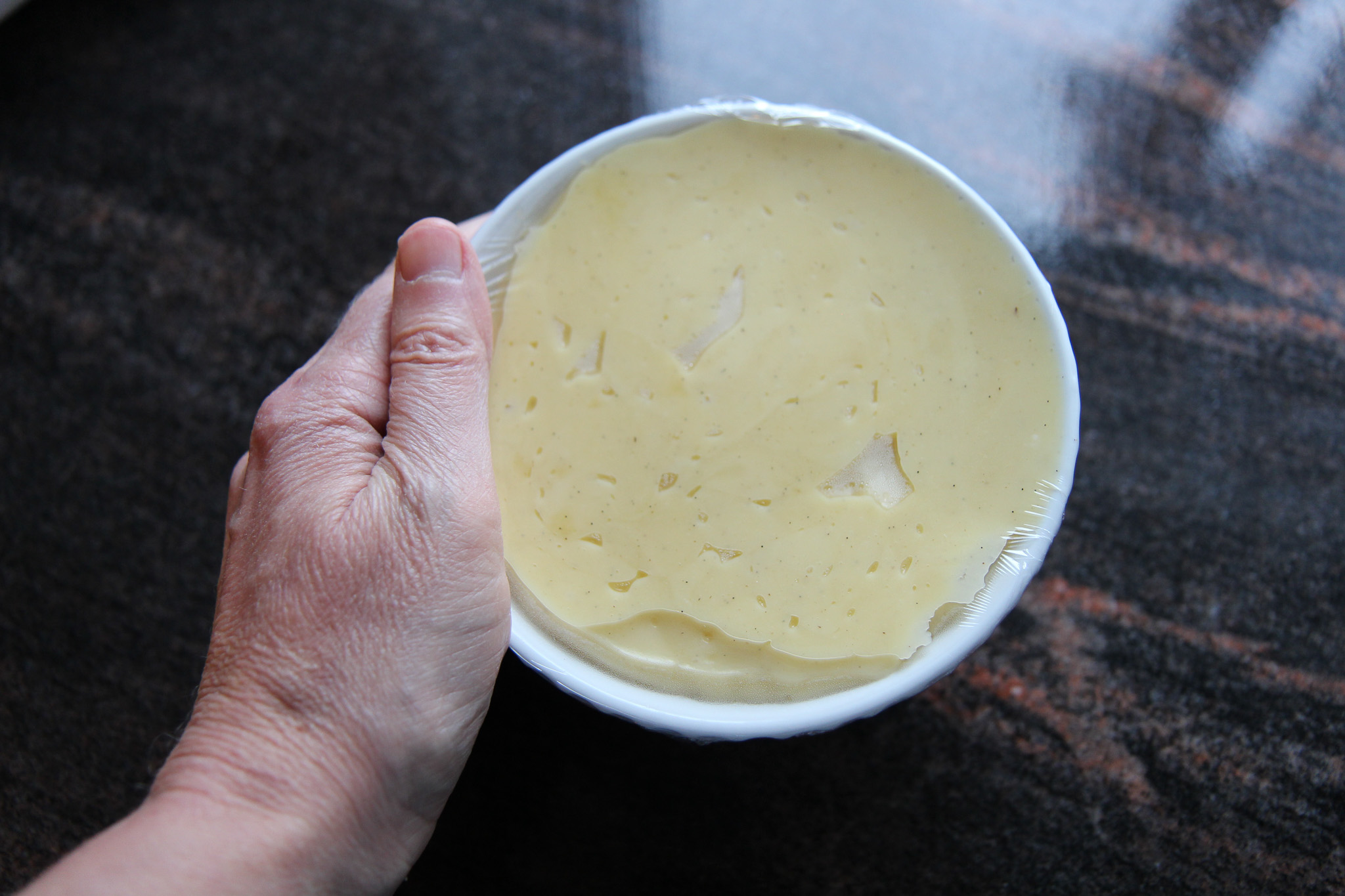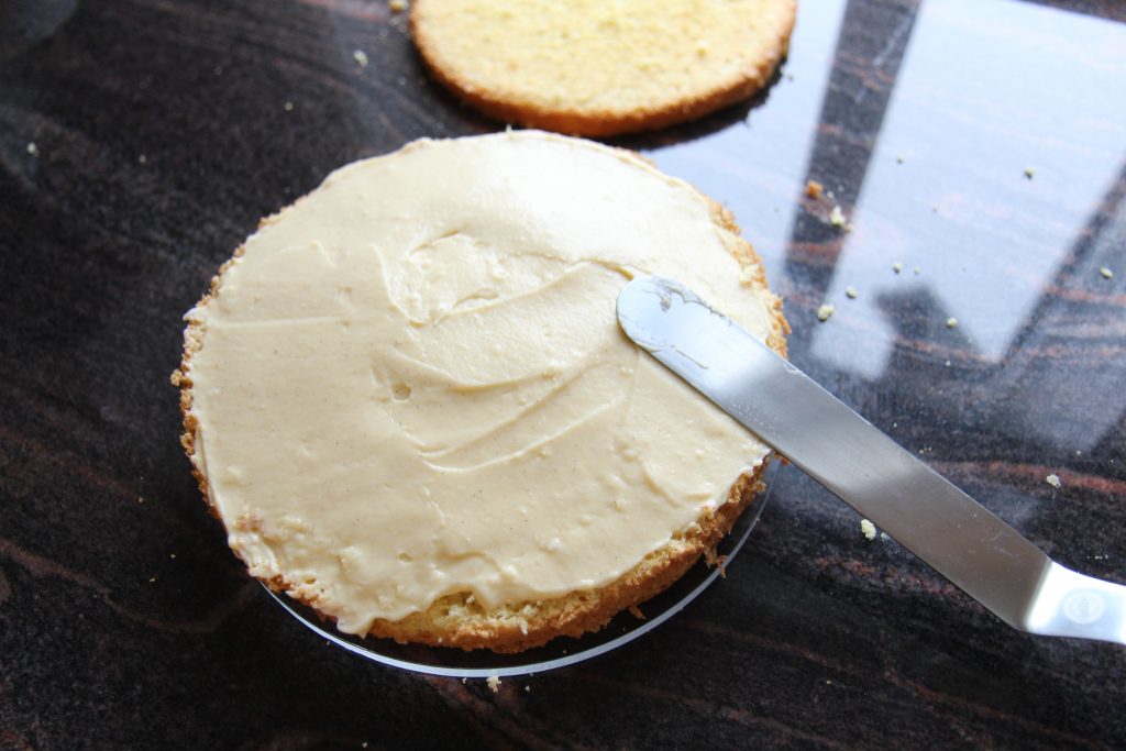 2. Rør opp all vaniljekremen (300- 400 g), stryk den på bunnen. Legg på siste delen av bunnen.