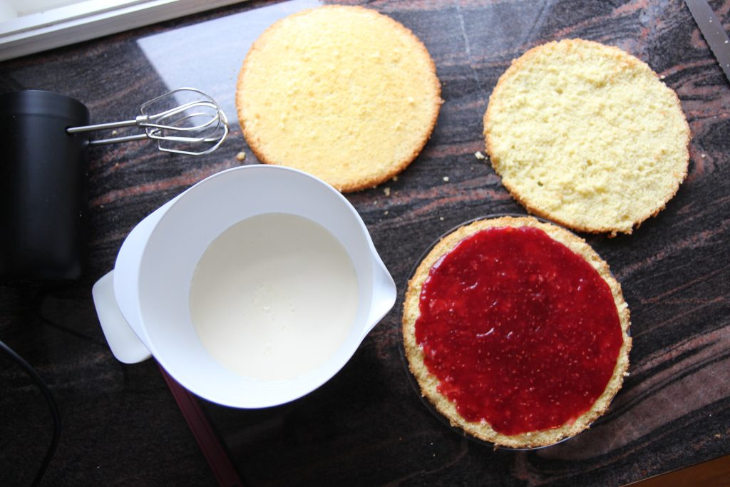 1. Del sukkerbrødet i tre. Legg den ene delen på fatet du skal servere kaka på. Stryk på godt med syltetøy, legg på neste del av bunn.
