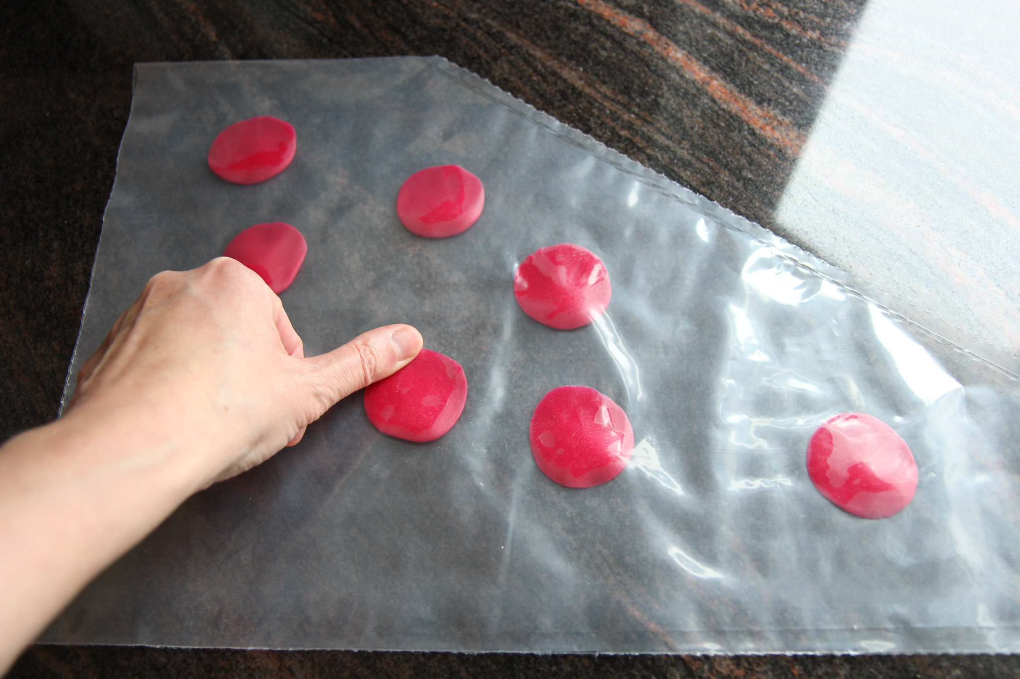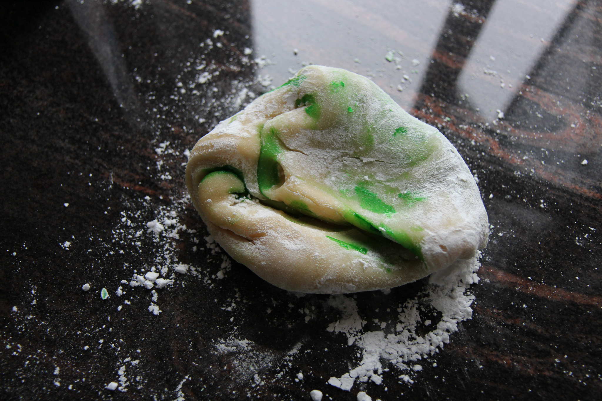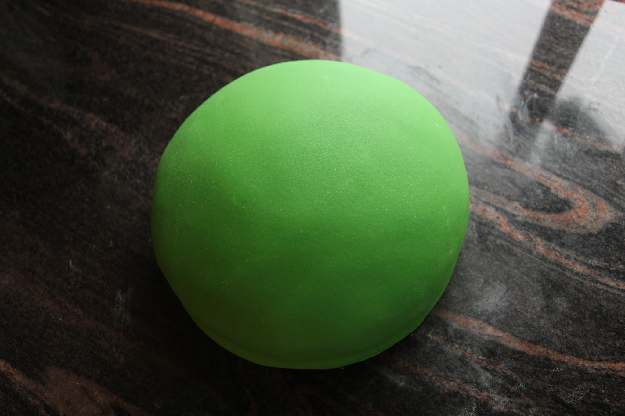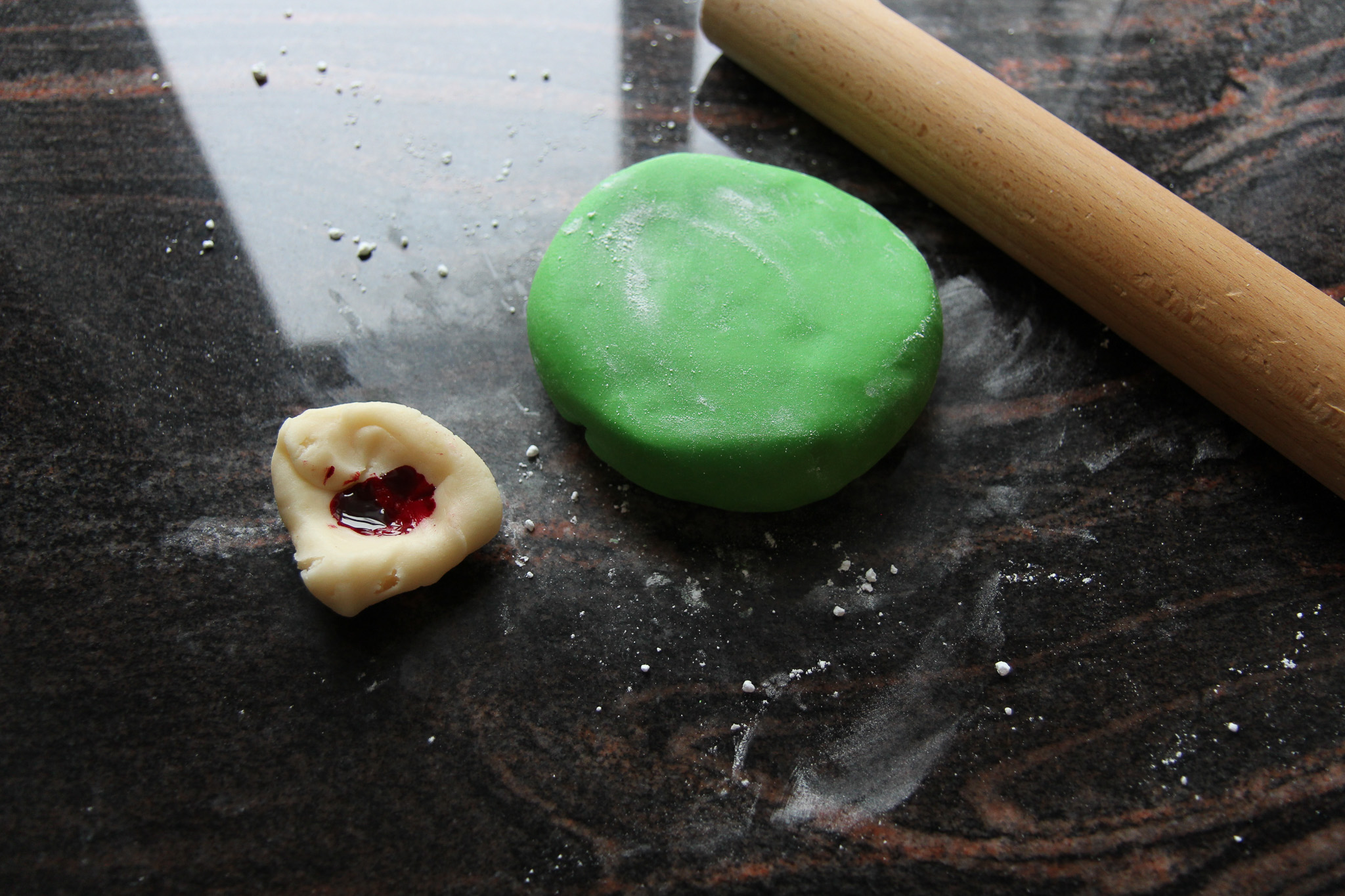5. Ta av en liten bit av marsipanen og farg rød/rosa. Farg resten grønn. Bruk godt med melis om du trenger.