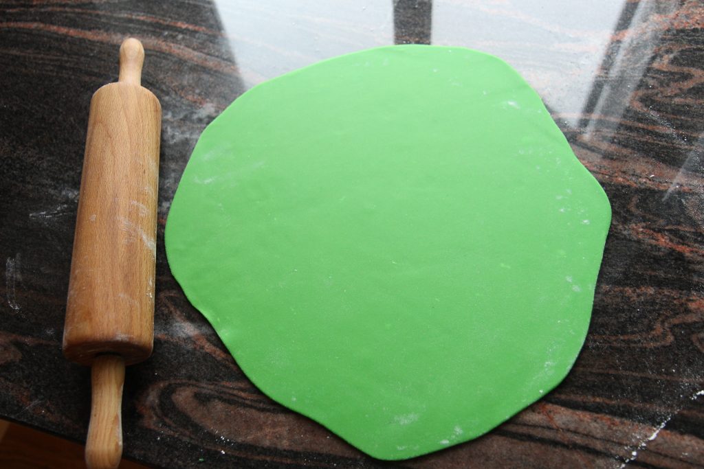 6. Kjevle ut marsipanen så den blir ca. 1.5 mm tykk. Legg på kaka, jeg brukte hendene og løftet den over.