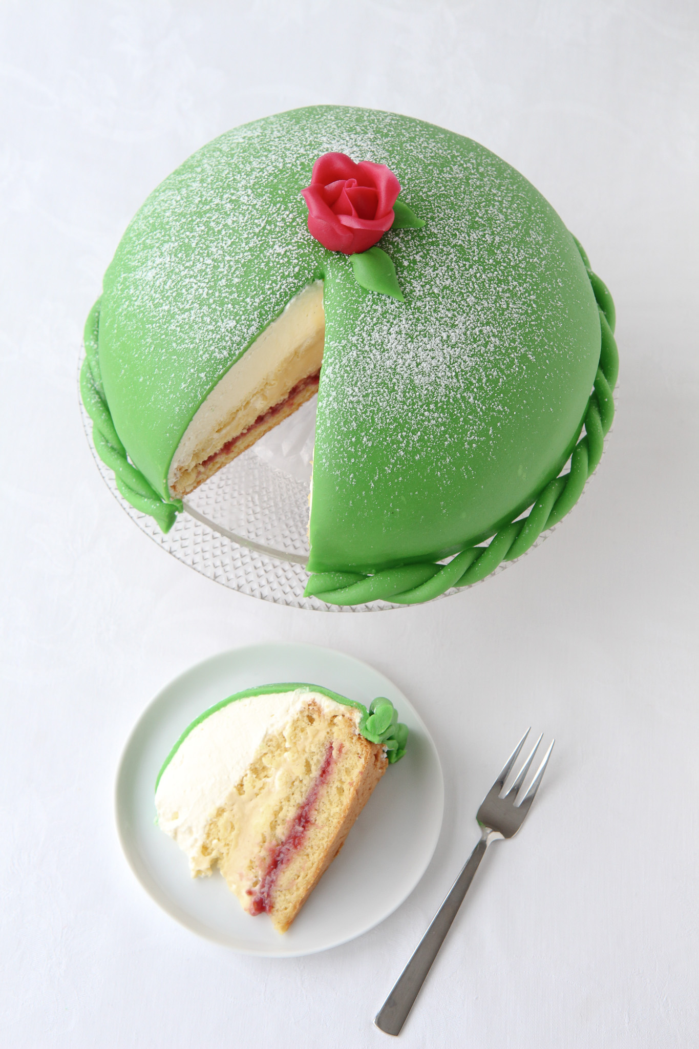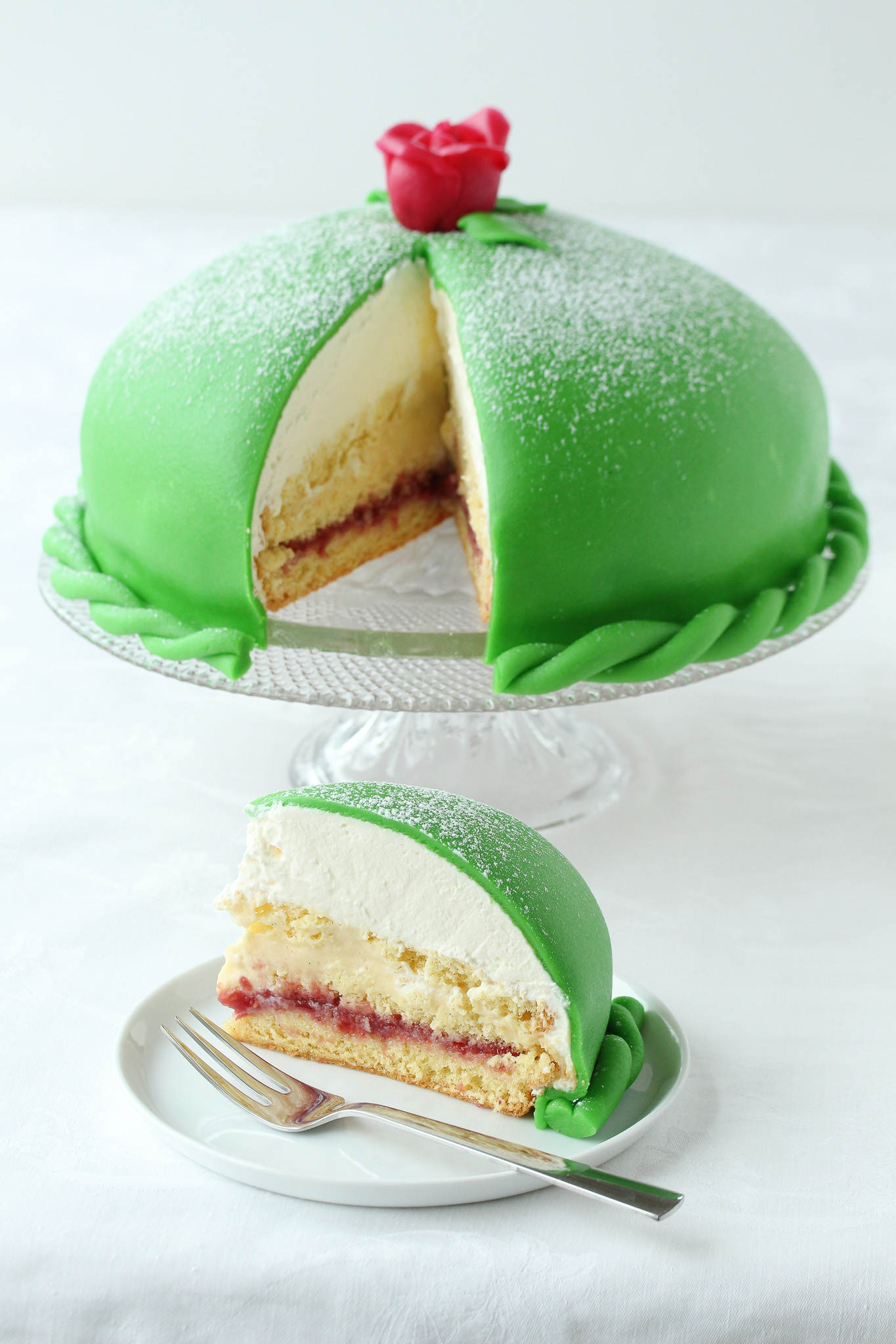 Dette er nemlig en svensk bløtkake-klassiker, lett å lage og lett og like. Jeg lagde et sukkerbrød med 4 egg, som passer fint i en springform som er ca. 22 cm i diameter. Både sukkerbrødet og vaniljekremen lagde jeg en dag i forveg, sånn at det bare var å piske krem, legge sammen kaken og trekke den med marsipan.