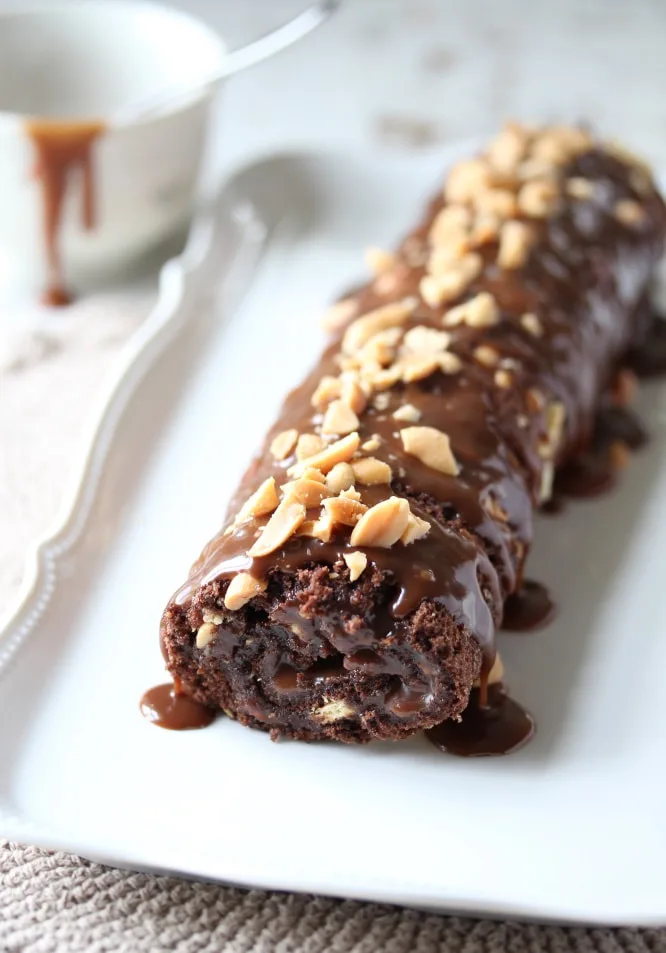 Saftig og myk sjokoladerullekake med karamell, sjokolade og peanøtter